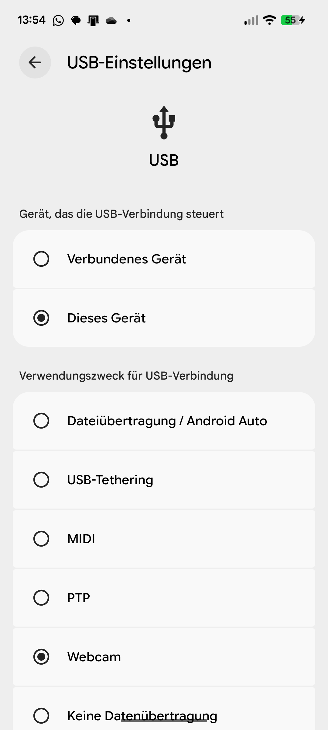 - Verbinde das Smartphone über ein USB-Kabel mit dem PC. Wähle dann auf dem Smartphone in den USB-Verbindungseinstellungen die Option Webcam.