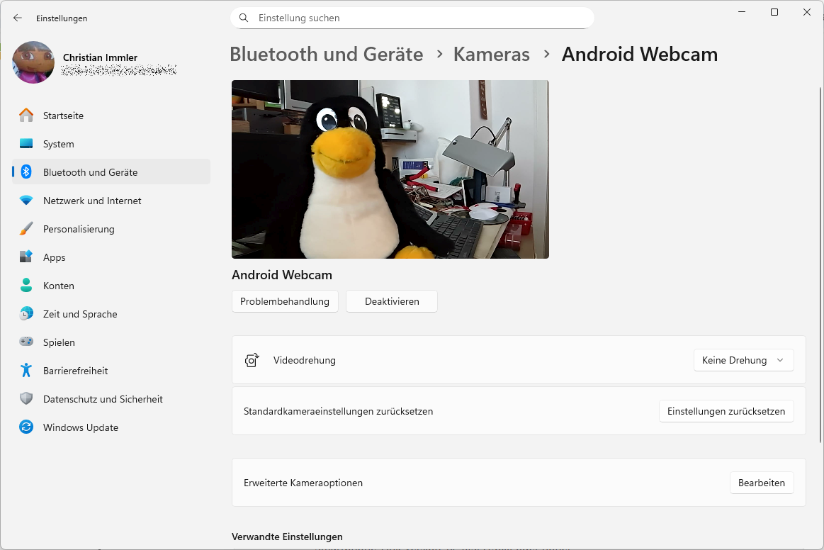 - Wähle in den Einstellungen auf dem PC unter Bluetooth und Geräte / Kameras die Android Webcam. Hier kannst Du bei Bedarf das Bild noch drehen.